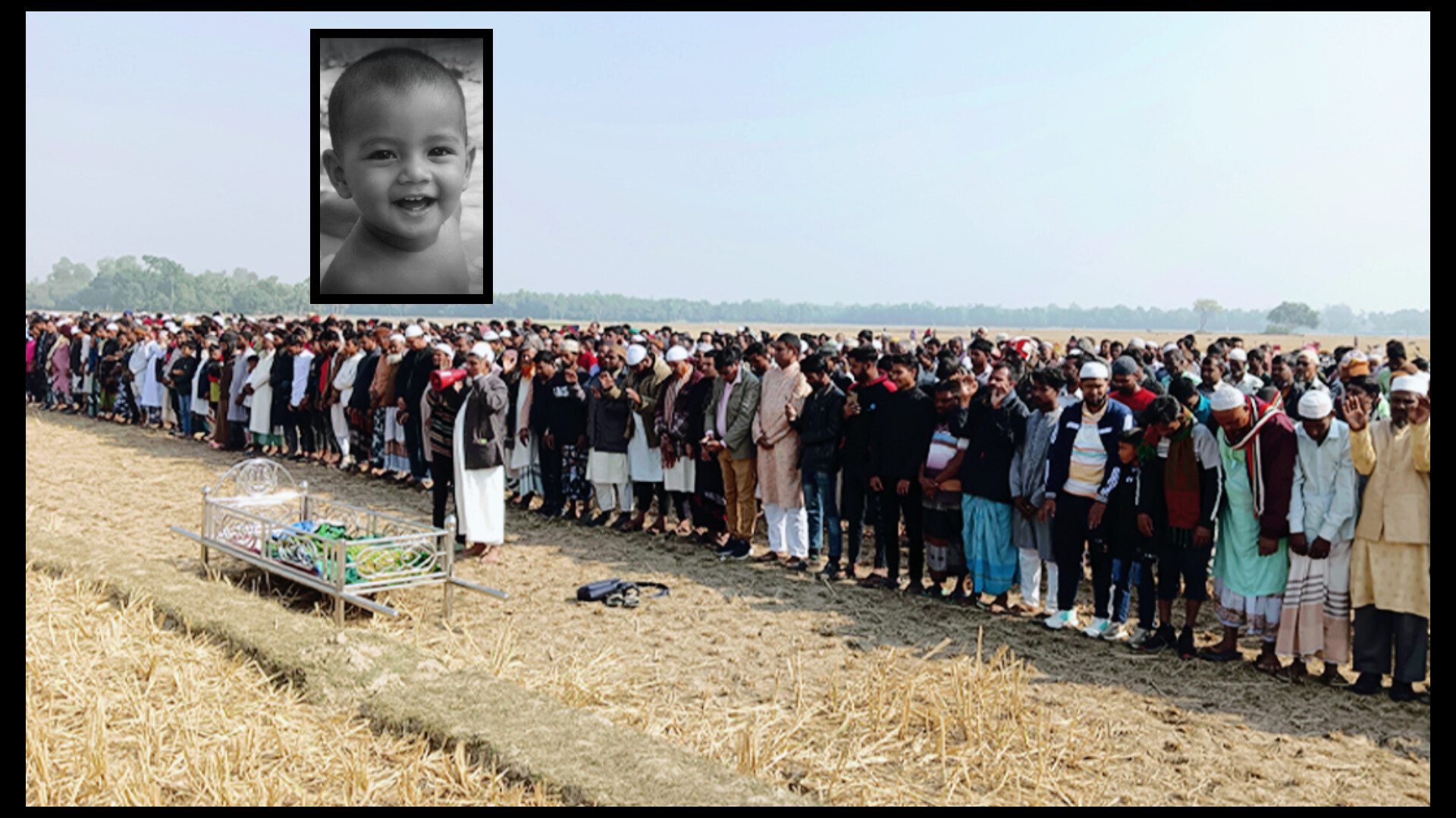রাজশাহীর তানোরে পরিত্যক্ত গভীর নলকূপে পড়ে দুই বছরের শিশু সাজিদের মর্মান্তিক মৃত্যুতে শোকের ছায়া নেমে এসেছে কোয়েলহাট গ্রামে। শুক্রবার (১২ ডিসেম্বর) সকাল ১০টায় জানাজার আগেই মাঠজুড়ে নেমে আসে মানুষের ঢল। গ্রামের প্রবীণ থেকে স্কুলপড়ুয়া শিশু—সবার চোখে ছিল জল। সাদা কাপড়ে মোড়ানো সাজিদের ছোট্ট দেহটি যখন সামনে আনা হয়, তখন কান্নার রোল পড়ে চারদিকে। শিশুটির মা বারবার ছুটে যেতে চাইছিলেন সন্তানের কাছে, আহাজারিতে ভারী হয়ে ওঠে পরিবেশ।