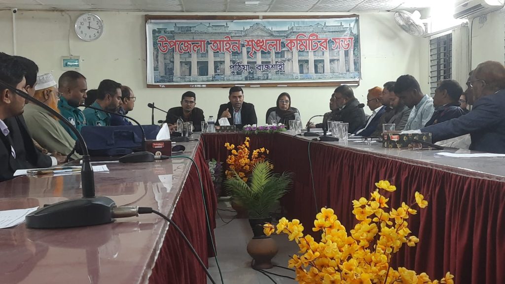 রাজশাহীর পুঠিয়া উপজেলায় আইন শৃঙ্খলা কমিটি ও মাসিক সাধারণ সভা অনুষ্ঠিত হয়েছে। বৃহস্পতিবার (২৭ অক্টোবর) বেলা ১১ টায় উপজেলার সম্মেলন কক্ষে আইন শৃঙ্খলা কমিটি ও মাসিক সাধারণ সভায় পুঠিয়া উপজেলা নির্বাহী অফিসার লিয়াকত সালমানের সভাপতিত্বে উপস্থিত ছিলেন পুঠিয়া সহকারী কমিশনার ভূমি শিবু দাস।