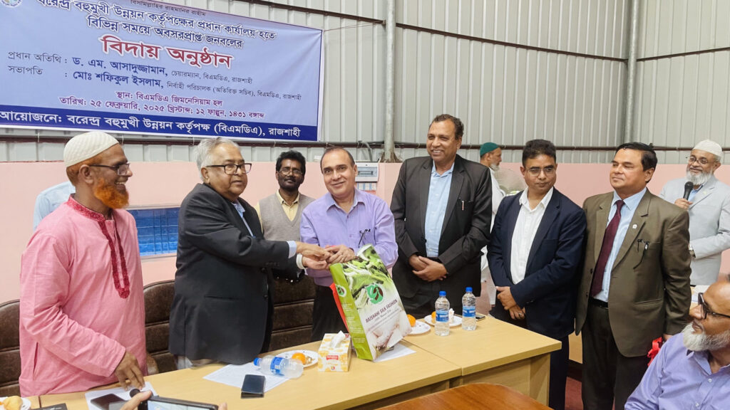 বরেন্দ্র বহুমুখী উন্নয়ন কর্তৃপক্ষের প্রধান কার্যালয় হতে বিভিন্ন সময়ে অবসরপ্রাপ্ত জনবলের বিদায় সংবর্ধনা অনুষ্ঠিত হয়েছে। মঙ্গলবার (২৫ফেব্রুয়ারি) বরেন্দ্র বহুমুখী উন্নয়ন কর্তৃপক্ষের আয়োজনে বিএমডিএ জিমনেসিয়াম হল রুমে ১৪জন অবসরপ্রাপ্ত কর্মকর্তা-কর্মচারীকে বিদায় সংবর্ধনা দেওয়া হয়।