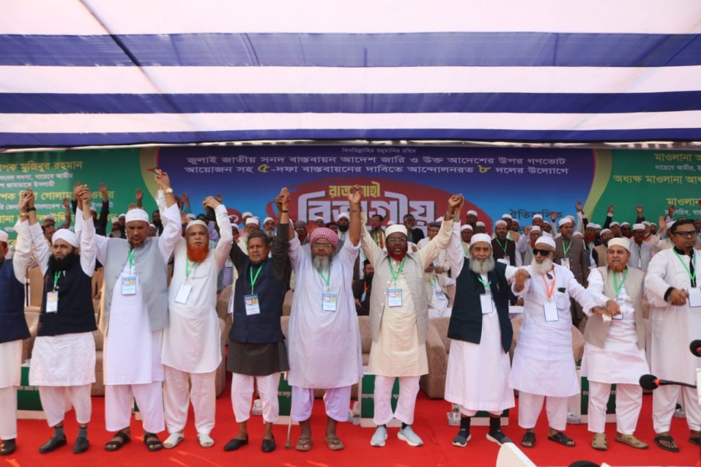 জুলাই জাতীয় সনদ বাস্তবায়ন আদেশ জারি ও উক্ত আদেশের উপর গণভোট আয়োজনসহ সন্ত্রাস ও চাঁদাবাজমুক্ত দেশ গড়তে ইসলামি সমমনা দলগুলো এক্যের ডাক দিয়েছে। রোববার (৩০ নভেম্বর) দুপুর ২.০০ টা থেকে ৪.০০ টা পর্যন্ত ৫ দফা দাবিতে ৮ দলের উদ্যোগে রাজশাহী ঐতিহাসিক মাদ্রাসা মাঠে রাজশাহী বিভাগীয় সমাবেশ অনুষ্ঠিত হয়েছে।