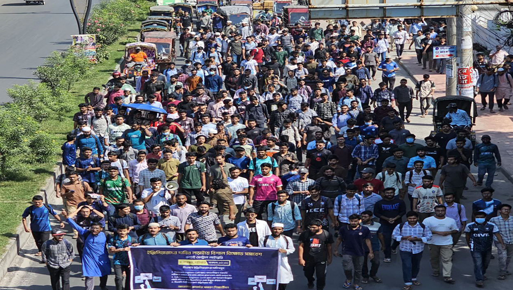 প্রকৌশল শিক্ষার্থীদের ৩ দফা দাবি: “ইঞ্জিনিয়ারিং ৯ম গ্রেডে সহকারী প্রকৌশলী বা সমমান পদে প্রবেশের জন্য সবাইকে পরীক্ষা দিয়ে উত্তীর্ণ হতে হবে এবং বিএসসি ডিগ্রিধারী হতে হবে। কোটার মাধ্যমে কোনো পদোন্নতি নয়, এমনকি অন্য নামেও সমমান পদ তৈরি করেও পদোন্নতি দেয়া যাবে না’, ‘টেকনিক্যাল ১০ম গ্রেডে উপ-সহকারী প্রকৌশলী বা সমমান পদ সবার জন্য উন্মুক্ত করতে হবে অর্থাৎ ডিপ্লোমা ও বিএসসি উভয় ডিগ্রিধারীকে পরীক্ষার সুযোগ দিতে হবে’, ‘ইঞ্জিনিয়ারিংয়ে বিএসসি ডিগ্রি ছাড়া কেউ ইঞ্জিনিয়ার পদবি ব্যবহার করতে পারবেনা, এই মর্মে আইন পাশ করে গেজেট প্রকাশ করতে হবে।”